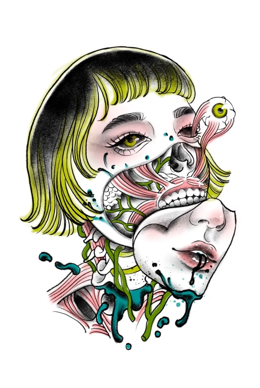Mechanical girl in colour. Also available in black and grey. Minimum 18cm. Ideal for thigh, back or calf.